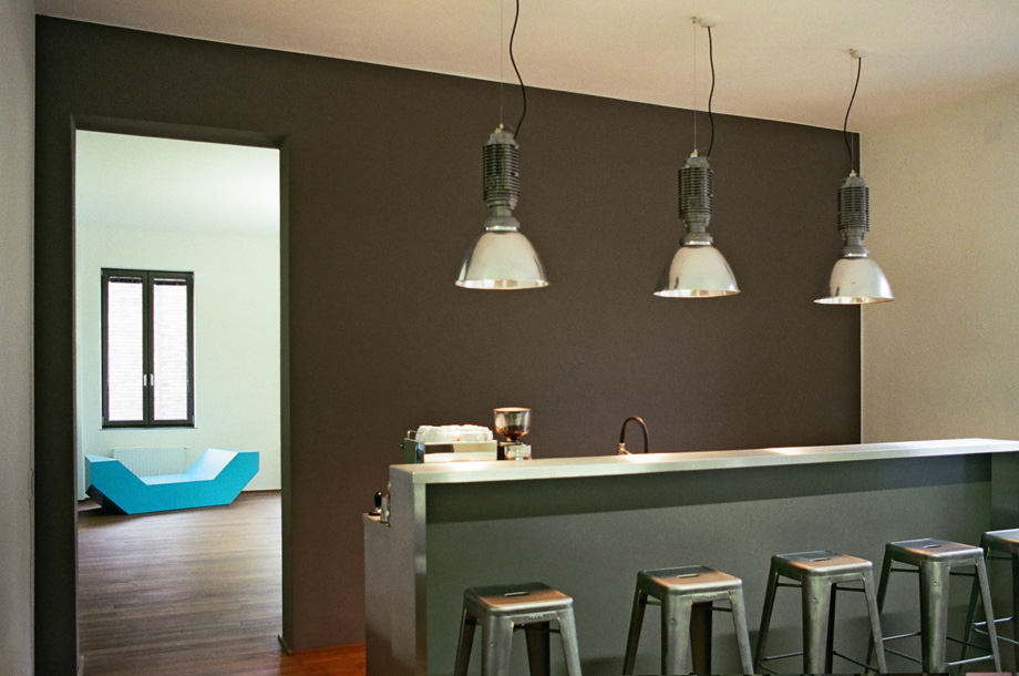 Das Gemeinschaftsbüro sollte einen loftartigen Charakter erhalten und gleichzeitig die Möglichkeit für absperrbare, akustisch getrennte Büroräume bieten. Dies wurde durch Stahl-Glaswände realisiert, die sich an den alten Fenstern der benachbarten Fabrikshallen orientieren. Die Küche ist als Kaffeebar konzipiert, die einerseits einen großzügigen Raumeindruck schafft und gleichzeitig einen Treffpunkt für Mitarbeiter und Kunden bildet. Das Farbkonzept in den Innenräumen wurde an die neue Fassaden- und Fenstergestaltung angelehnt.
