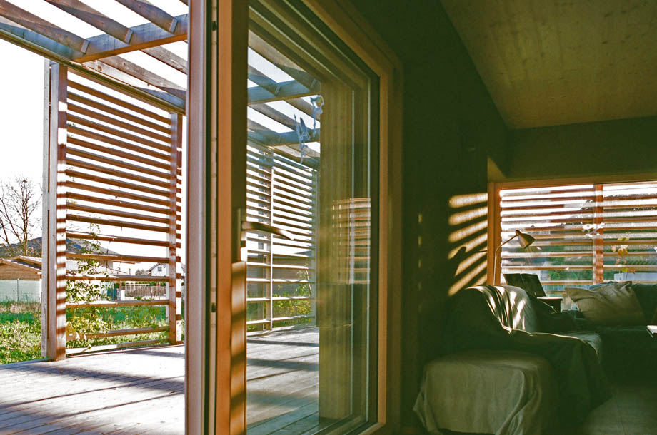 Der Bungalow inmitten des großzügigen Grundstückes öffnet sich nach Süden zu einer Veranda, die durch eine raumbildende Pergola eingefasst wird und einen Übergangsbereich zwischen Innen- und Außenraum bildet. Die Besonnung und Privatheit der Pergola und auch der dahinter liegenden Innenräume lässt sich durch verschiebbare Pergola-Elemente steuern. Die künftige Bepflanzung mit Kletterpflanzen lässt sich ebenfalls durch Rückschnitt im Herbst an den erforderlichen Sonnenschutz anpassen.