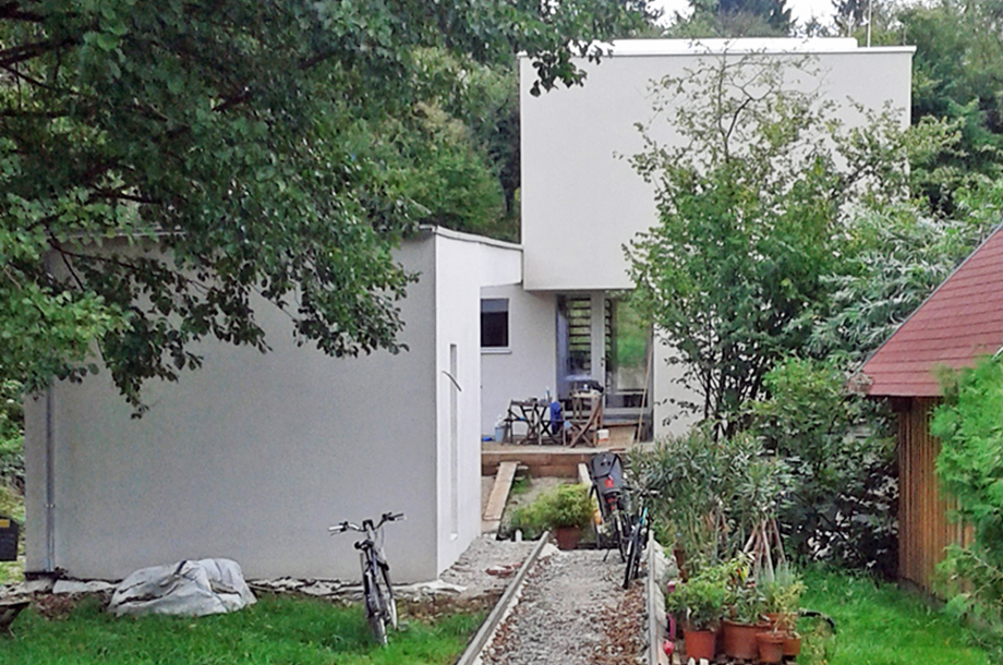 Das Haus überspannt den Bach, der das Grundstück der Familie durchkreuzt und umrahmt den magischen Platz am Wasser. Der Zugang zum Haus führt über eine Brücke und setzt sich im Gebäude als Weg durch das Haus fort. Ein offener Wohnbereich, an den die Schlafzimmer angrenzen mäandeert dreidimensional durch das Haus und verbindet mit einem Luftraum die Geschoße.