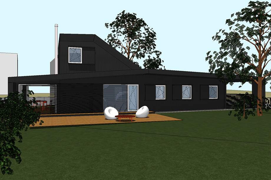 Das Entwurfskonzept des Sommerhauses beruht auf einen Weinviertler-Streckhof, der quer zum Eckgrundstück platziert wurde. Das Gebäude trennt den nördlichen, öffentlicheren Einfahrtshof vom südlichen, privateren Gartenbereich. Ein Carport auf der Ostseite und eine verschließbare Veranda auf der Westseite sowie ein umlaufendes Vordach spenden im Sommer Schatten und sind ein idealer Witterungsschutz und bilden den räumlichen Übergang zwischen innen und außen.