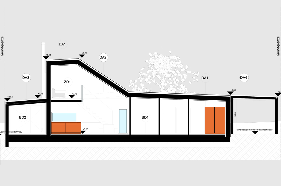 Das Entwurfskonzept des Sommerhauses beruht auf einen Weinviertler-Streckhof, der quer zum Eckgrundstück platziert wurde. Das Gebäude trennt den nördlichen, öffentlicheren Einfahrtshof vom südlichen, privateren Gartenbereich. Ein Carport auf der Ostseite und eine verschließbare Veranda auf der Westseite sowie ein umlaufendes Vordach spenden im Sommer Schatten und sind ein idealer Witterungsschutz und bilden den räumlichen Übergang zwischen innen und außen.