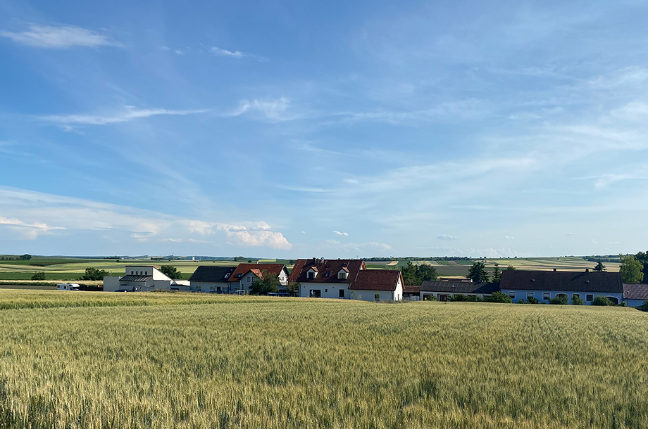 Ein neu geschaffener Durchbruch verbindet Wohnzimmer und Wohnküche des bestehenden Einfamilienhauses und schafft weite Blickachsen durch das Haus und in die umliegenden Weizenfelder. Ein dreiseitig verglaster Kaminofen spendet in den Wintermonaten eine angenehme Wärme und sein gemütliches Feuer kann von allen Stellen des Raumes betrachtet werden. Die neu gewonnene Großzügigkeit und Behaglichkeit wird durch den einheitlich verlegten Eichenparkett unterstrichen.